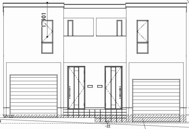 2階建てのテラスハウスで、このように左右に世帯が分かれています。1階がガレージになっているので、2階にリビングがある間取りになっています。
