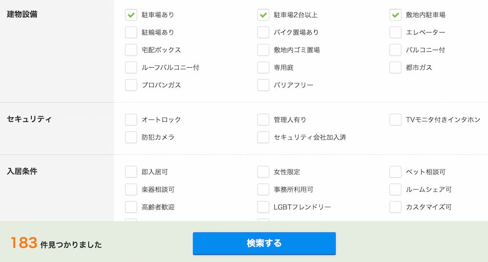 これに先ほどの「駐車場を2台停められる」という条件をプラスして検索するともっと絞られると思いますが、問題はどれくらい絞られるか?です。