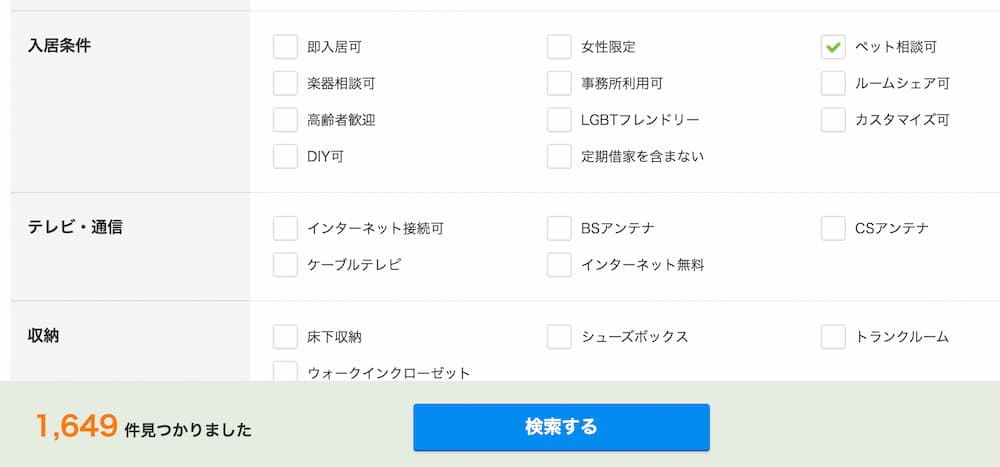ペット相談可で絞ると、なんと1649件もお部屋が出てきました!これはイメージよりだいぶ多い印象ではないでしょうか。これだと3部屋に1部屋がペット相談可ということになります。築10年以内の築浅アパートはペット可にするところも多くなっているのでしょうかね。