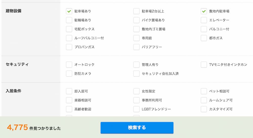 敷地内に駐車場がある物件は4,775件もありました。もちろんこの中で駅が近いとか、スーパーや飲食店が多くて便利とか物件ごとの強みは濃淡あると思いますが、この中から私の物件を選んでもらうのは超激戦でしょう。