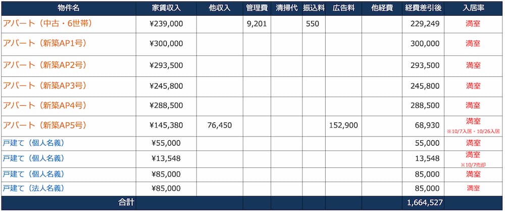 今月は5棟目新築APが2世帯とも埋まったことで、所有物件が全室満室となりました。10月は日割り家賃だけで広告料もかかっていますが、来月は月間家賃180万円を超えていく見込みです。