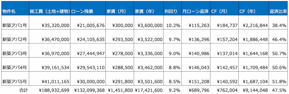 次に、これまで2022年〜2025年にかけて建築した新築アパート累計の収支についてまとめます。