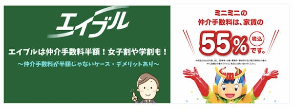 最近は「仲介手数料は半額!(=家賃の0.5ヶ月分)」というPRが増えています。業界大手のエイブルやミニミニも、そのような打ち出しをしていますよね。