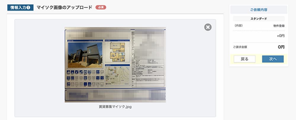 管理画面でマイソク画像をアップロードすると、エコーズ側で基本情報を入力してくれるサービスです。