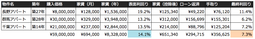 私の所有アパート3棟は、長野県、群馬県、千葉県エリアがバラバラなのですが、最新の利回り・収支状況は以下のようにになっています。