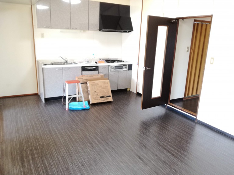 キッチンは新しいものの、リビングが黒のフロアで暗い印象です。