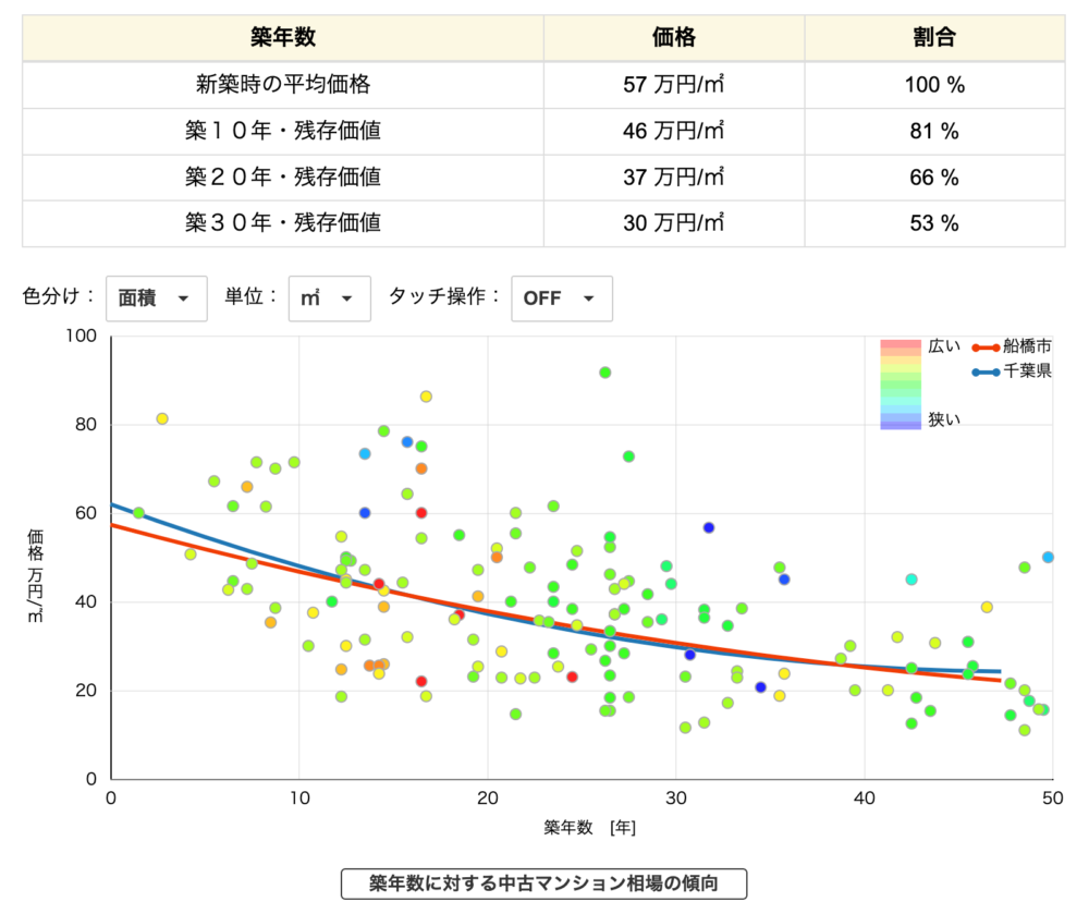 新築時から、経年でどのように価格が下落していくのか、ざっと把握することができます。