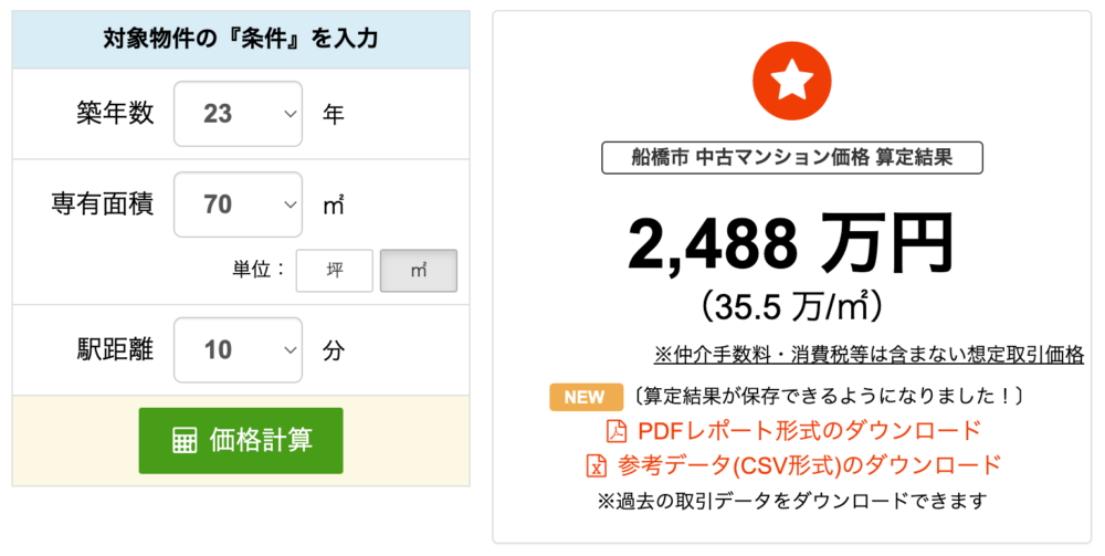 検索した地域の築年数に応じた単位㎡当たりの平均マンション価格が、面積や駅からの距離等に応じて変化するので初めての方にも一目でわかりやすいです。