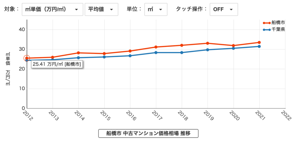 不動産の価格相場や家賃相場の推移についても、グラフで簡単に確認できます。