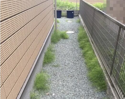 以下は違う現場ですが同じような現象が起こっていて、こちらは防草シートの上に砂利を敷いているのですが、こちらも塀のキワキワのところや、基礎の近くは草が生えていますよね。