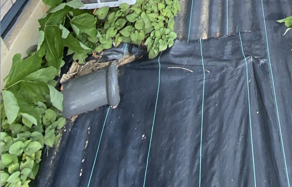 これが毎年2〜3回くらい草むしりしても、また翌年には生えてきます。私が敷いたホームセンターの安い防草シート(以下写真の黒いシート)の隙間からもたくさん生えてきていますね。