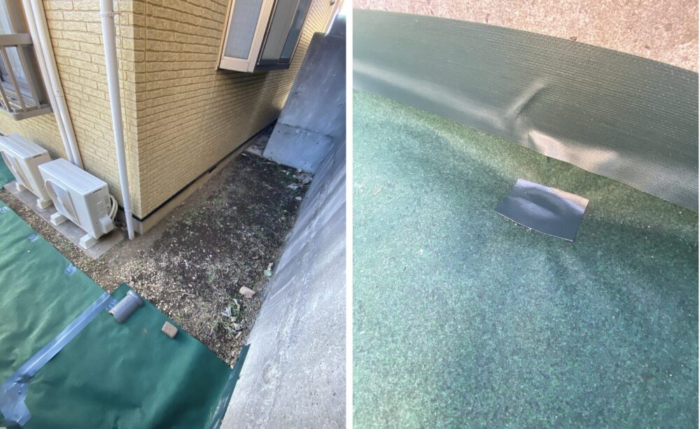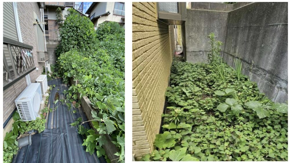 以下のイメージですね。アパートの基礎立ち上がりと防草シートの隙間から生えてきてますよね。